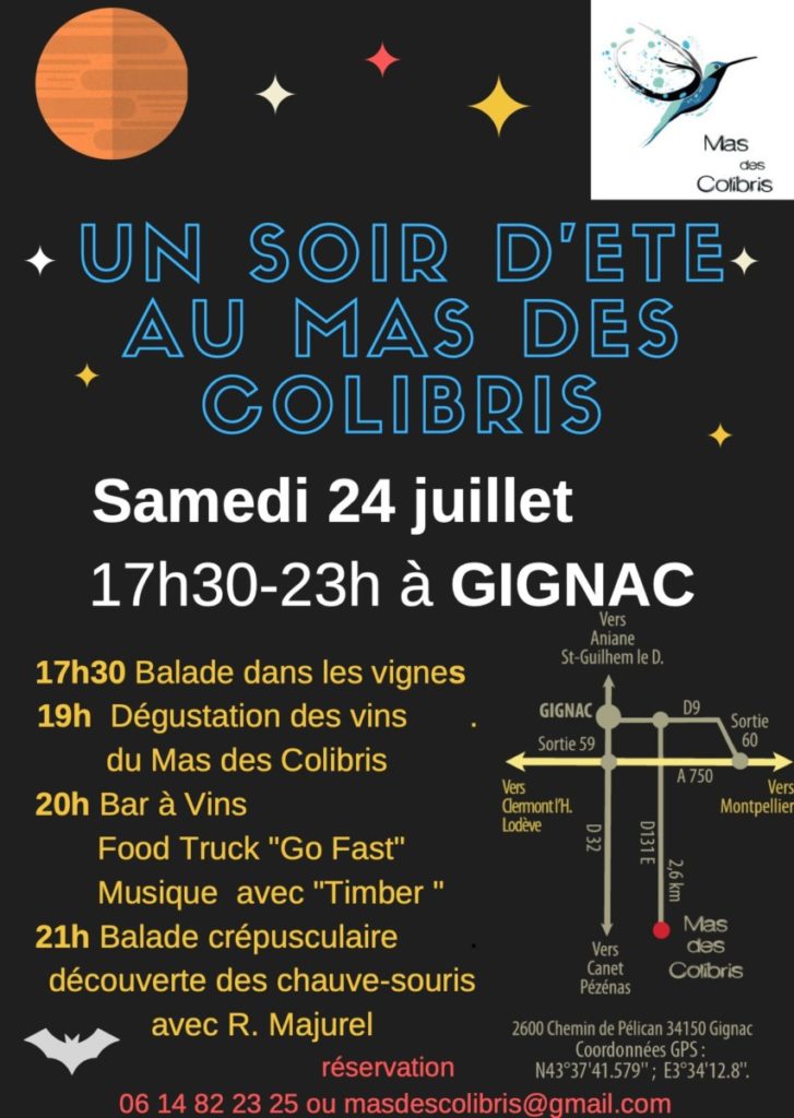 C’est la traditionnelle soirée festive au Mas des Colibris, au programme balade dans les vignes, dégustation, musique, food truck,…